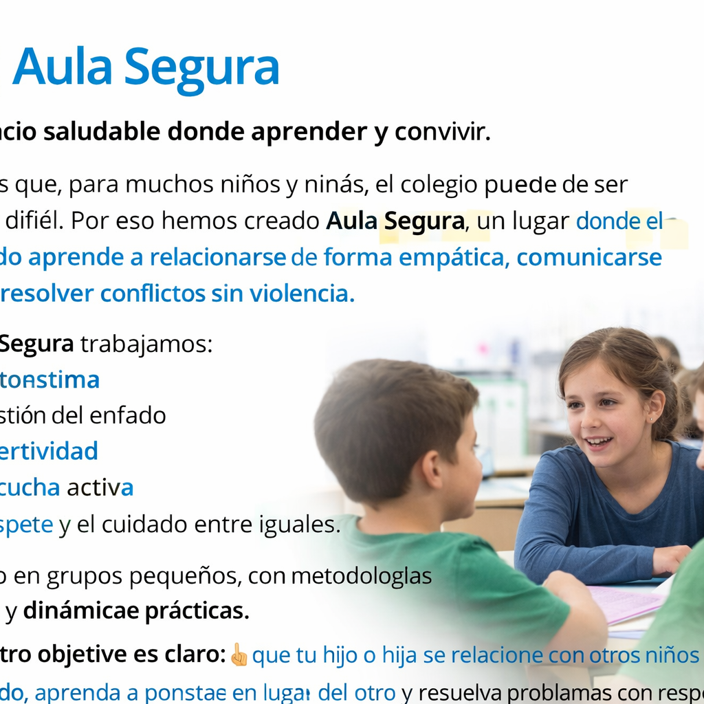 Por eso hemos creado Aula Segura, un espacio donde el alumnado aprende a relacionarse de forma empática, comunicarse mejor y resolver conflictos sin violencia.